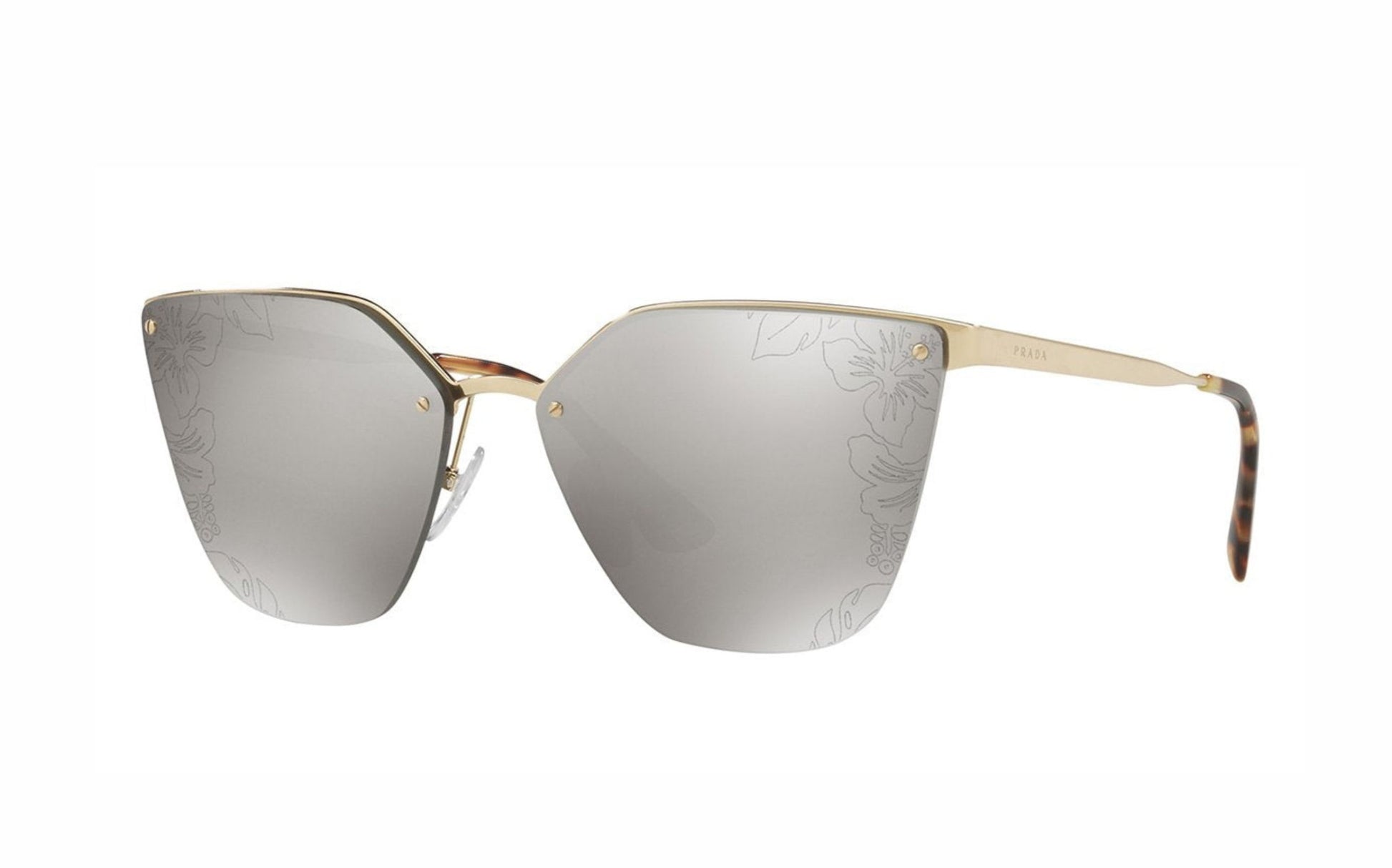 Prada PR 68TS ZVN-121 sunglasses in a bold Cat-Eye / Butterfly design with a light gold full-frame and decorative gray-silver mirrored lenses. Size 63-15-140, offering 100% UV protection for a feminine, chic, and elegant look.