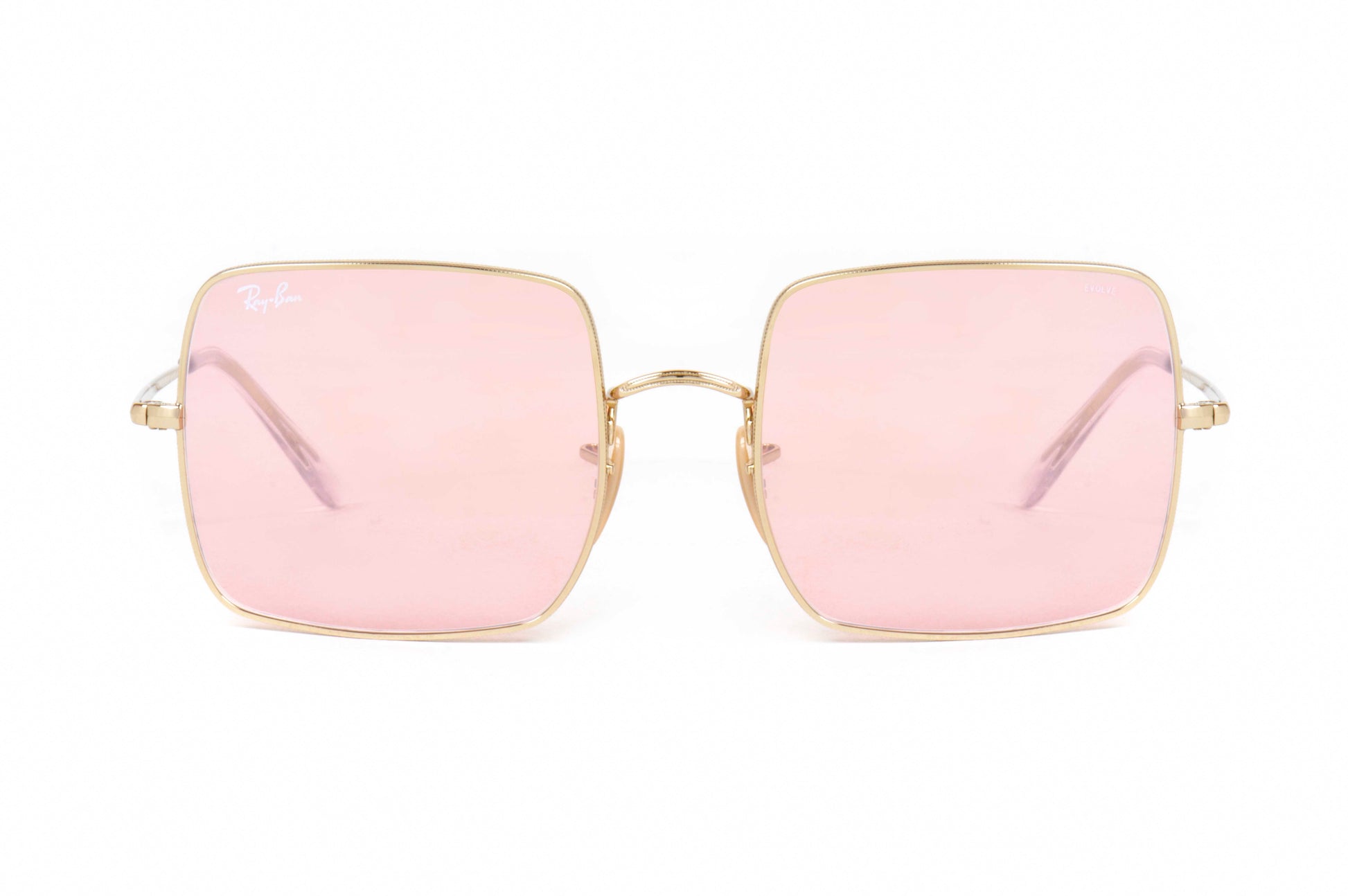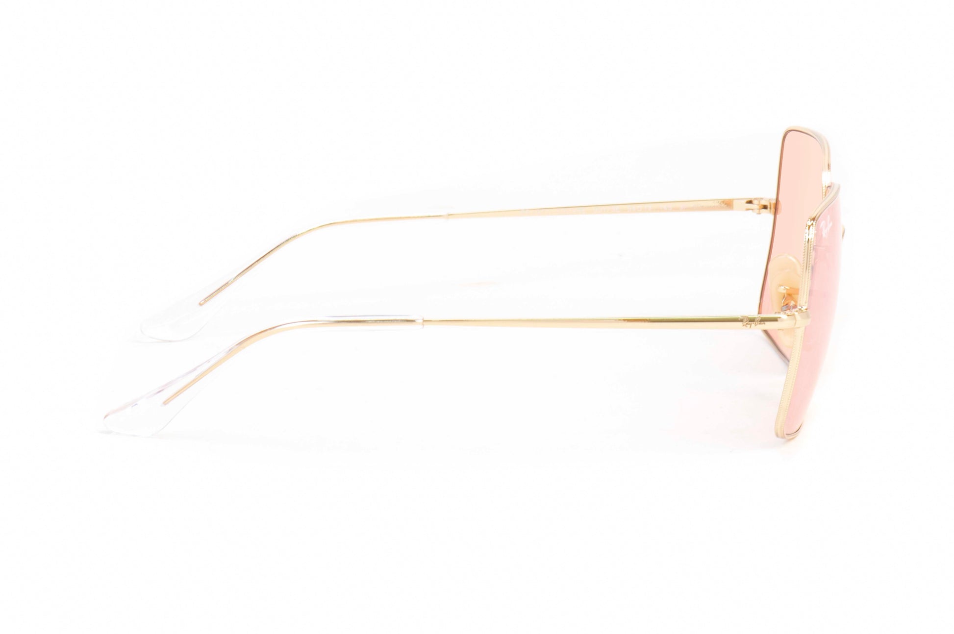 Features a shiny gold metal frame paired with beautiful pink photochromic mirrored glass lenses.